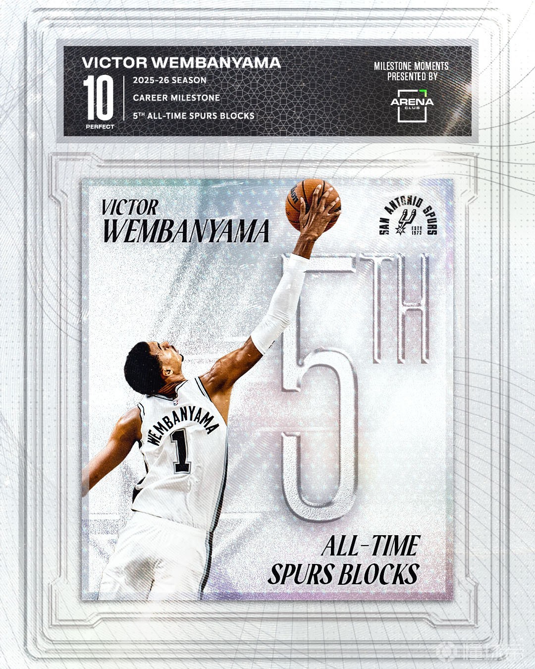 在比赛开局不到2分钟时,文班就已经送出3次封盖,至此,他的生涯盖帽总数来到544次,超越比利-鲍尔兹,升至马刺队史第5位。
