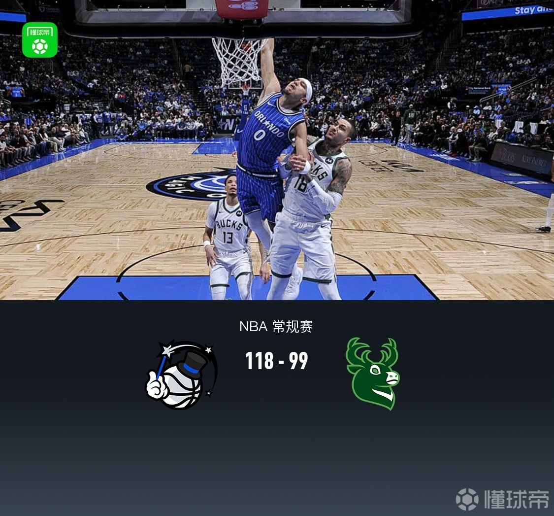 第四节魔术布莱克拿下9分,雄鹿小凯文-波特拿下6分,最终魔术118-99战胜雄鹿