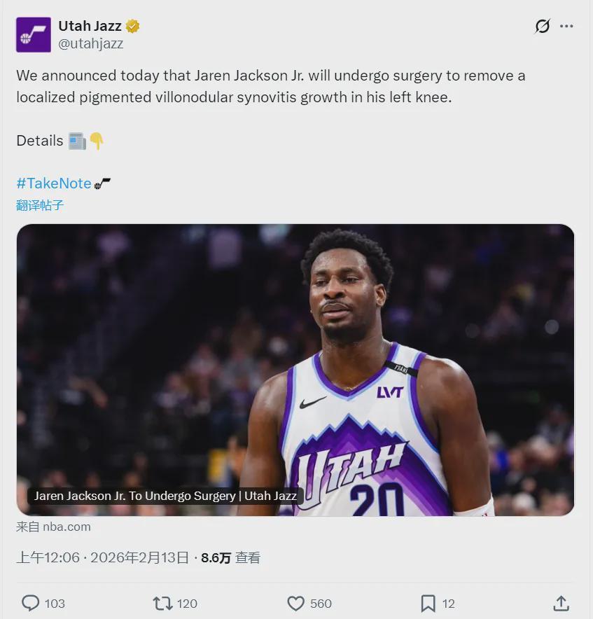 今天凌晨,犹他爵士队官方宣布:小贾伦-杰克逊将接受手术,切除左膝局部色素绒毛结节性滑膜炎增生,本赛季报销。NBA名记Tim MacMahon补充报道,爵士在交易体检的过程中,已经发现了这个问题,但爵士坚持完成了交易。