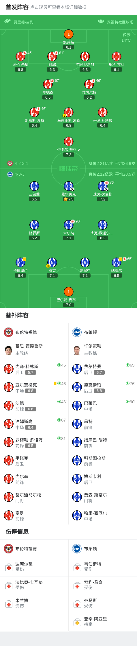 北京时间2月21日,英格兰足球顶级联赛第27轮,布伦特福德主场对阵布莱顿。比赛中,迭戈-戈麦斯、维尔贝克分别破门。最终,布伦特福德0-2不敌布莱顿。