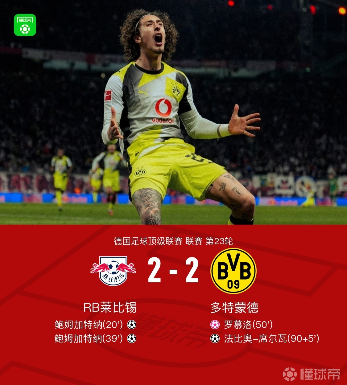 北京时间2月22日德国足球顶级联赛 联赛 第23轮,RB莱比锡主场对阵多特蒙德。上半场迪奥曼德晃动送助攻,鲍姆加特纳破门,之后劳姆传中,鲍姆加特纳破门完成双响。下半场罗慕洛头球自摆乌龙,补时阶段阿德耶米传中,法比奥-席尔瓦扳平。最终多特2-2战平莱比锡。