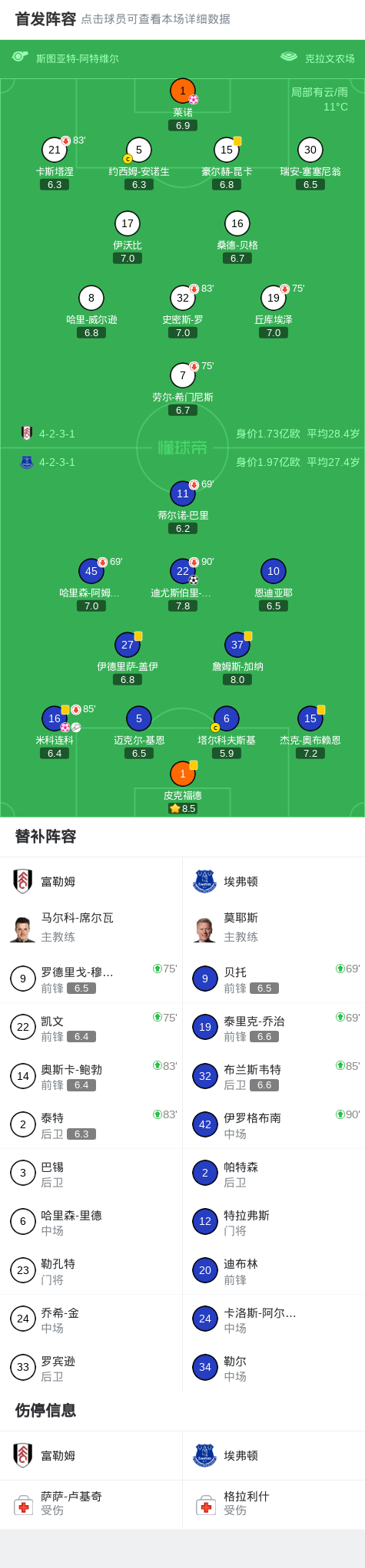 北京时间2月7日英格兰足球顶级联赛 联赛 第25轮,富勒姆主场对阵埃弗顿。富勒姆莱诺自摆乌龙。上半场埃弗顿迪尤斯伯里-霍尔破门,下半场米科连科自摆乌龙,门将莱诺自摆乌龙。最终比分富勒姆 1-2 埃弗顿。