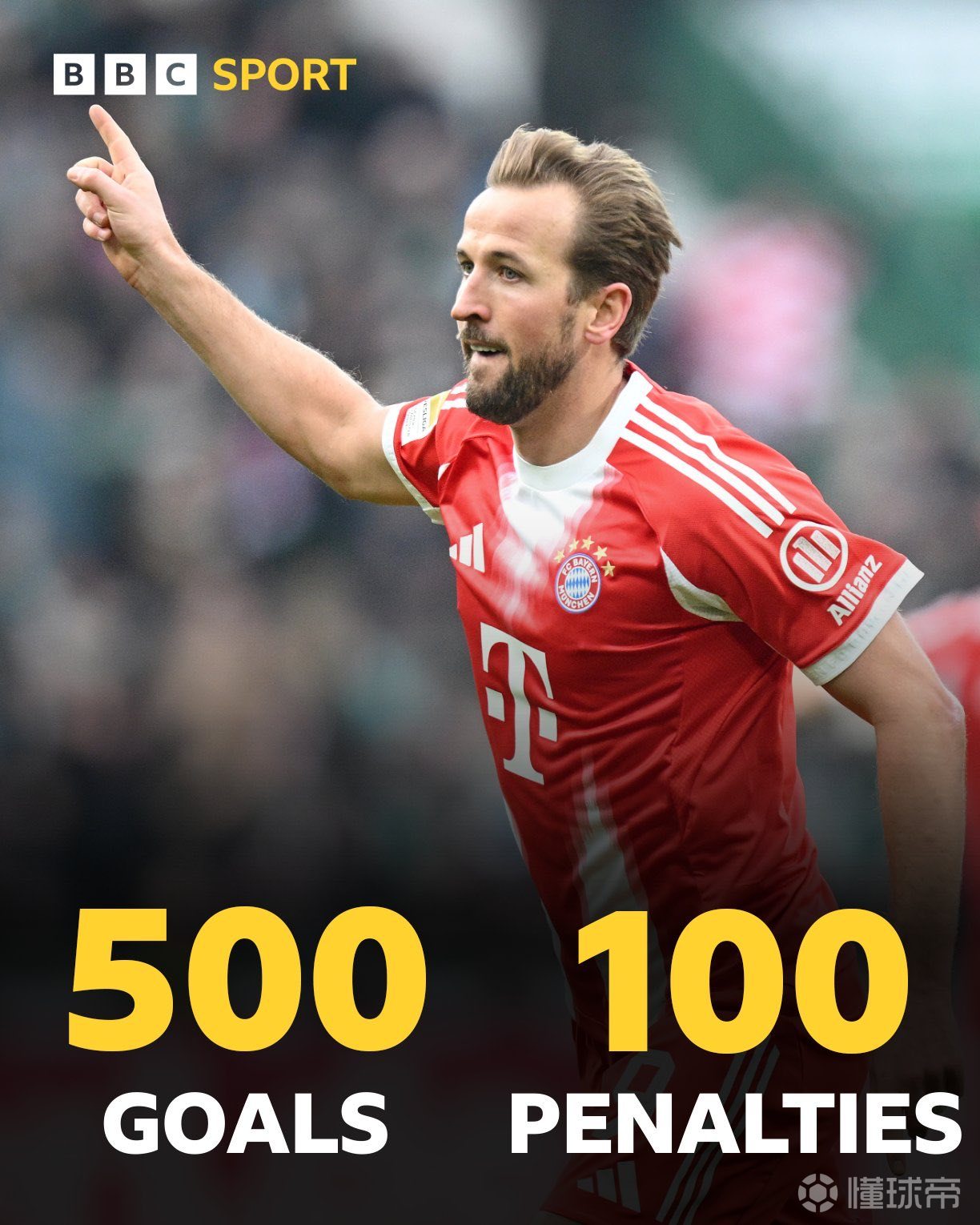 凯恩职业生涯已攻入500个进球,其中100个点球